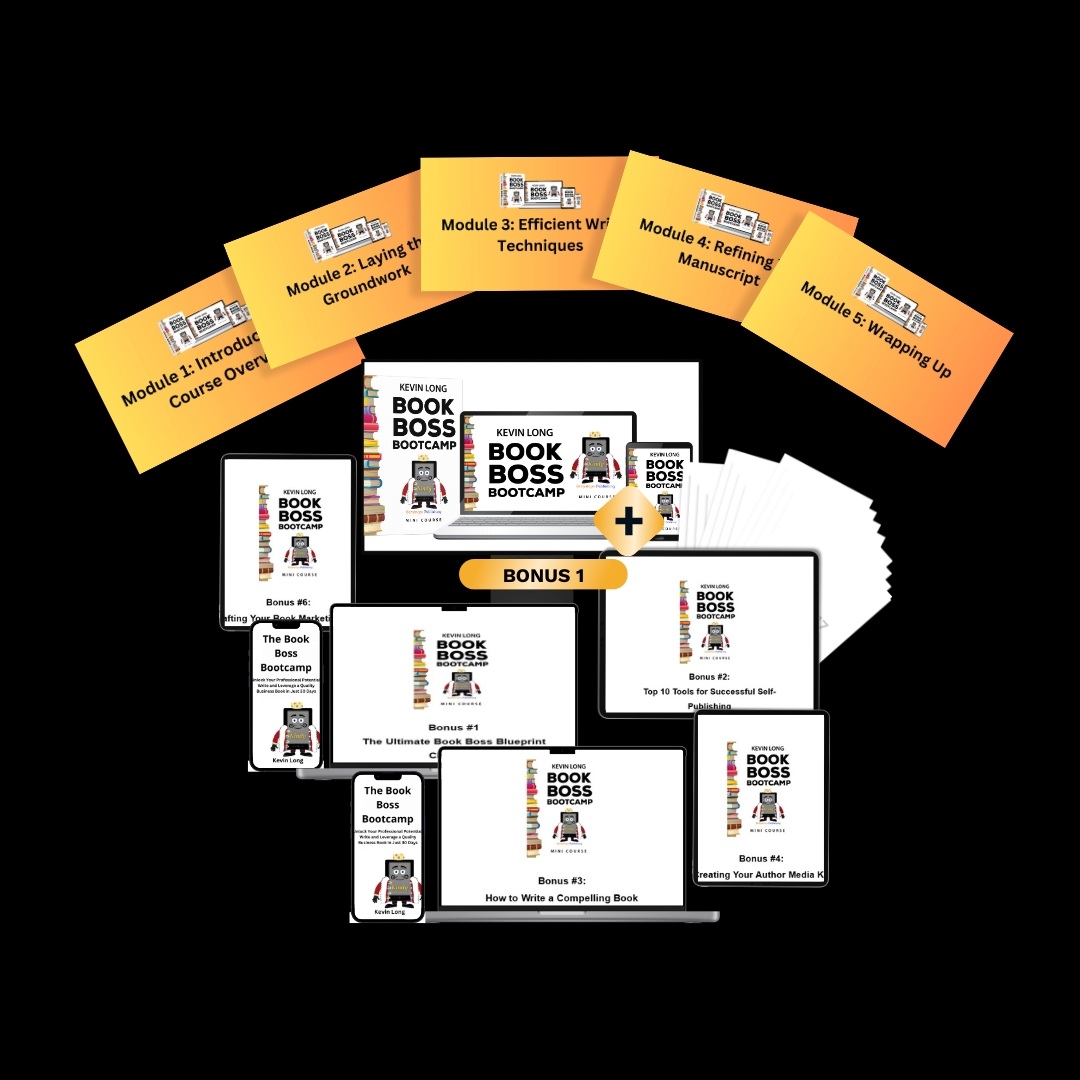 You'll receive access to five detailed modules that guide you from the basics of understanding your book's purpose to writing and refining your manuscript efficiently. Each module is packed with actionable advice and step-by-step instructions using our Book Boss Blueprint.
